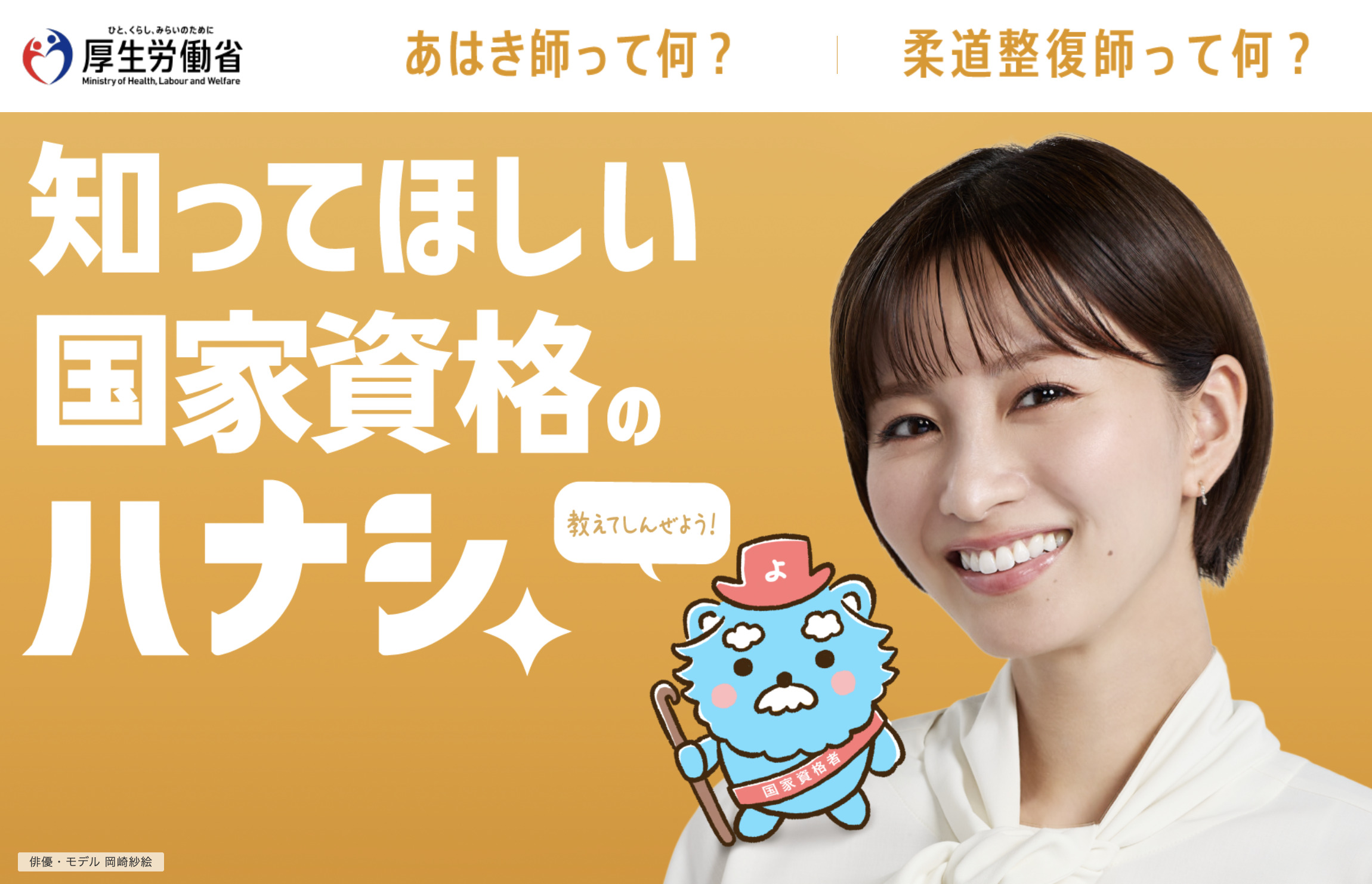 2026.03.05 岡崎 紗絵 広告 厚生労働省『適切な診療・施術を受けるための機会の選択等に資する広報事業』「あはき・柔整師 編」広告出演 厚生労働省『適切な診療・施術を受けるための機会の選択等に資する広報事業』「あはき・柔整師 編」知ってほしい国家資格のハナシ │ 厚生労働省